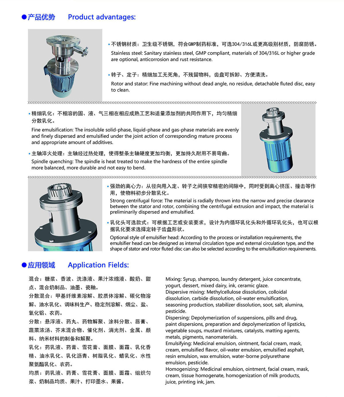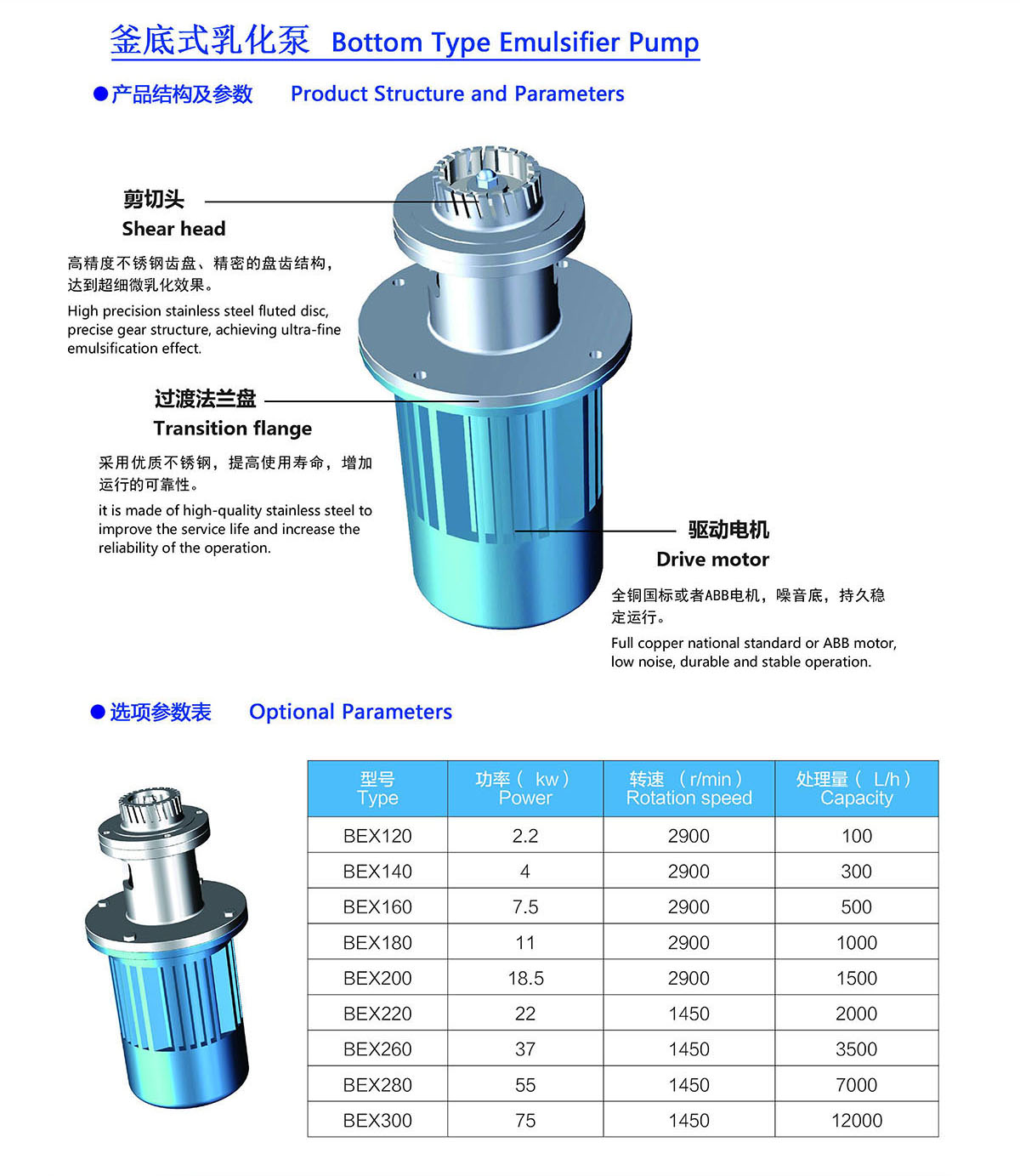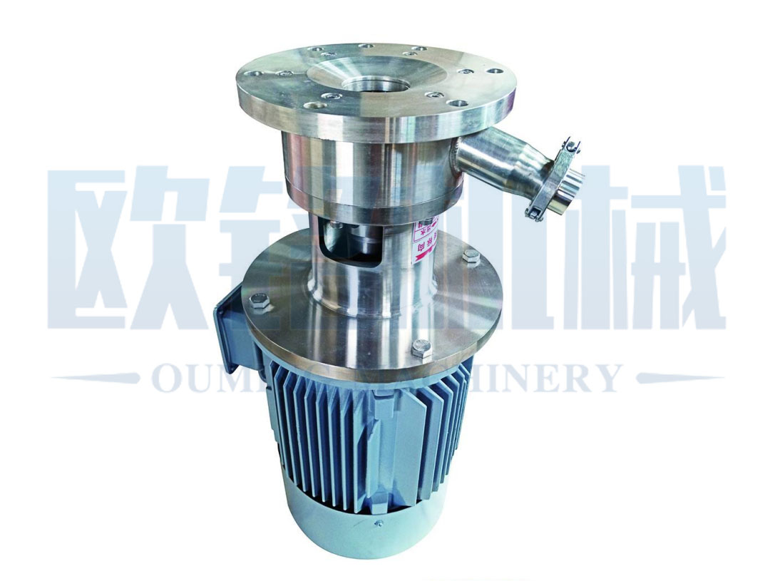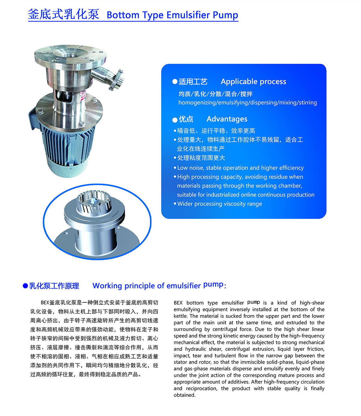 BEX釜底乳(ru)(ru)化(hua)泵是一(yi)種(zhong)倒立(li)式(shi)安裝(zhuang)于釜底的(de)高(gao)(gao)剪(jian)切乳(ru)(ru)化(hua)設(she)備,物(wu)料(liao)從主機(ji)上部與下部同(tong)時吸入(ru),并向(xiang)四周(zhou)離心擠出(chu),由于轉子高(gao)(gao)速(su)旋(xuan)轉所(suo)產生的(de)高(gao)(gao)剪(jian)切線速(su)度和高(gao)(gao)頻(pin)機(ji)械(xie)效應帶來的(de)強(qiang)(qiang)勁(jing)動能,使物(wu)料(liao)在(zai)定子和轉子狹(xia)窄的(de)間隙(xi)中(zhong)受到強(qiang)(qiang)烈(lie)的(de)機(ji)械(xie)及液(ye)(ye)力剪(jian)切、離心擠壓、液(ye)(ye)層摩擦、撞(zhuang)擊撕裂(lie)和湍流(liu)等(deng)綜(zong)合(he)作(zuo)用,從而使不相(xiang)溶(rong)的(de)固(gu)相(xiang)、液(ye)(ye)相(xiang)、氣相(xiang)在(zai)相(xiang)應成熟工藝和適量(liang)添加劑(ji)的(de)共同(tong)作(zuo)用下,瞬間均勻精細地分散乳(ru)(ru)化(hua),經過(guo)高(gao)(gao)頻(pin)的(de)循環往復,最終得到穩定品質的(de)產品。