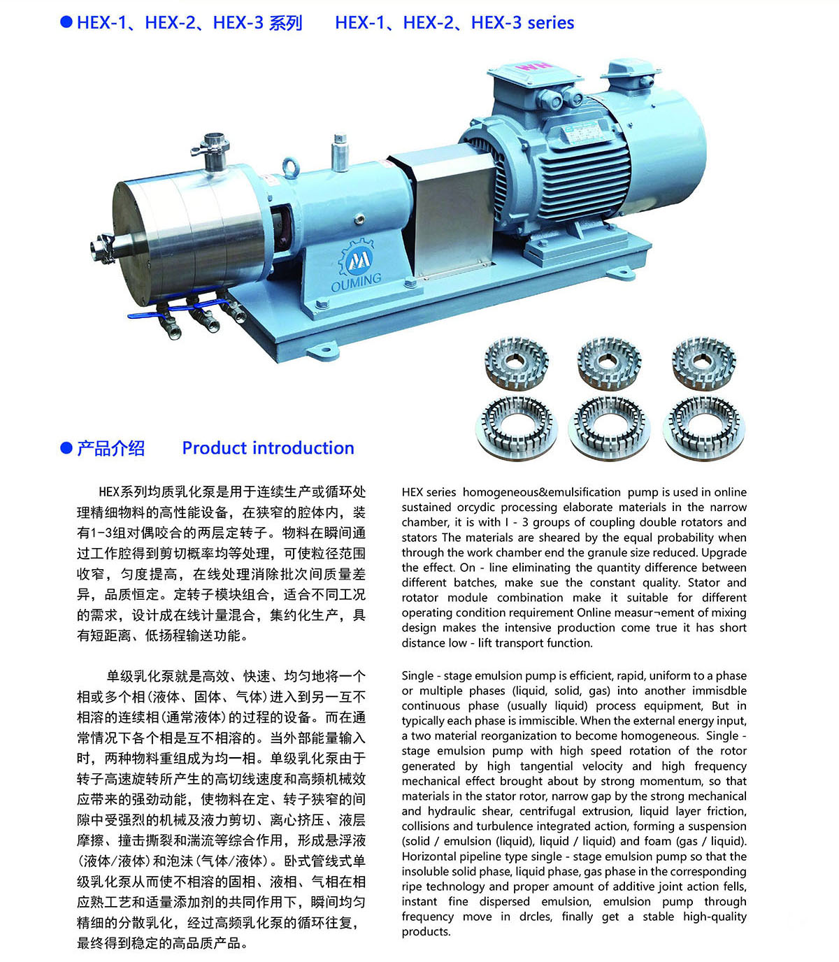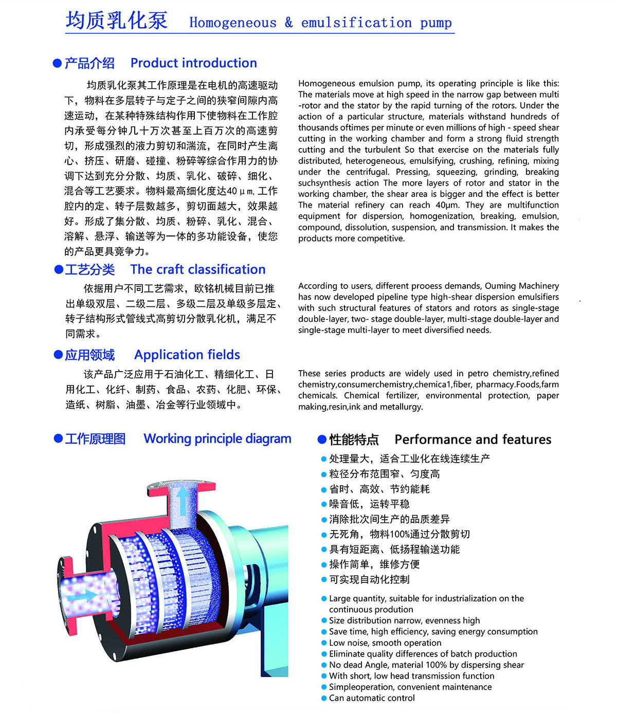均(jun)質(zhi)乳(ru)化(hua)泵其工作(zuo)(zuo)原理是在電(dian)機的(de)高速(su)驅動下(xia),物(wu)料(liao)在多(duo)層轉子與(yu)定子之(zhi)間(jian)的(de)狹窄間(jian)隙內(nei)高速(su)運動,在某種特殊結構作(zuo)(zuo)用(yong)下(xia)使(shi)物(wu)料(liao)在工作(zuo)(zuo)腔內(nei)承(cheng)受每(mei)分(fen)鐘幾十萬(wan)次甚至上(shang)百萬(wan)次的(de)高速(su)剪(jian)切,形成強烈的(de)液力剪(jian)切和湍流,在同時產(chan)生離心、擠壓(ya)、研磨、碰撞、粉(fen)碎(sui)等綜合作(zuo)(zuo)用(yong)力的(de)協調(diao)下(xia)達(da)到充(chong)分(fen)分(fen)散、均(jun)質(zhi)、乳(ru)化(hua)、破碎(sui)、細化(hua)、混(hun)合等工藝要(yao)求。物(wu)料(liao)最(zui)高細化(hua)度達(da)40μm,工作(zuo)(zuo)腔內(nei)的(de)定、轉子層數越(yue)多(duo),剪(jian)切面越(yue)大,效果(guo)越(yue)好。形成了集分(fen)散、均(jun)質(zhi)、粉(fen)碎(sui)、乳(ru)化(hua)、混(hun)合、溶解、懸浮、輸(shu)送等為一體的(de)多(duo)功能設(she)備(bei),使(shi)您(nin)的(de)產(chan)品更具競爭(zheng)力。